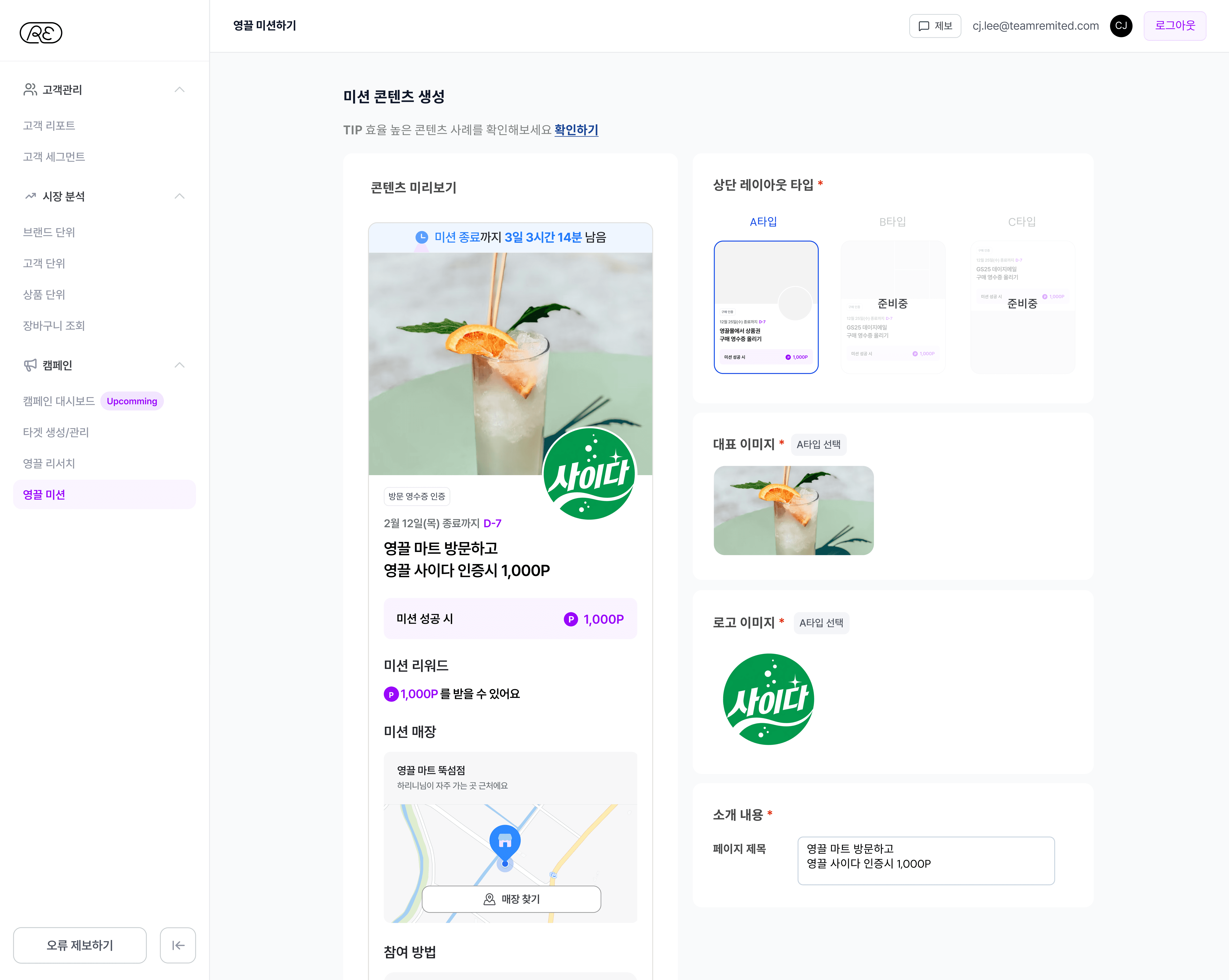 구매, 방문 등 미션 목표를 설정하고 미션 내용을 직접 세팅하세요.