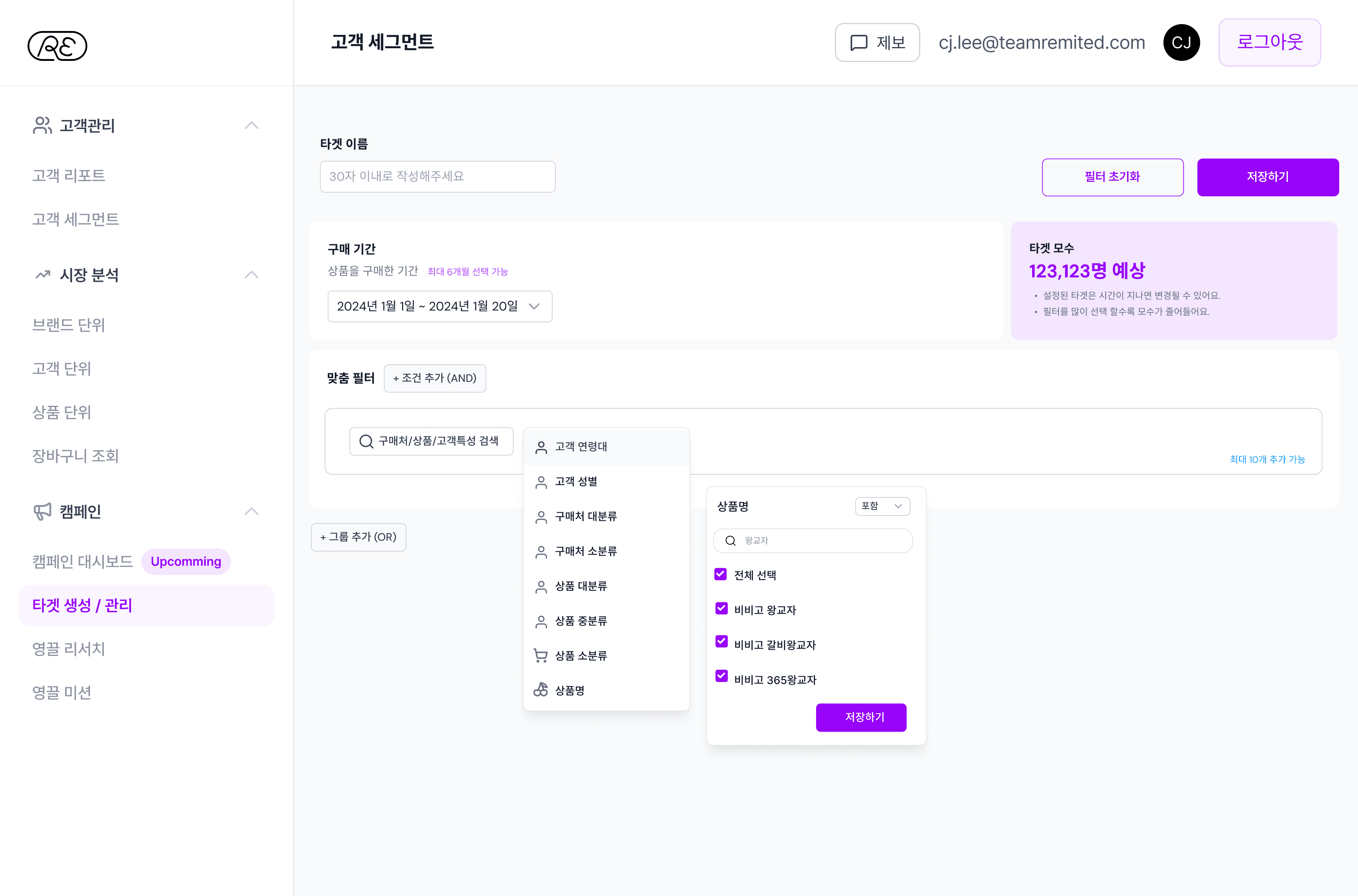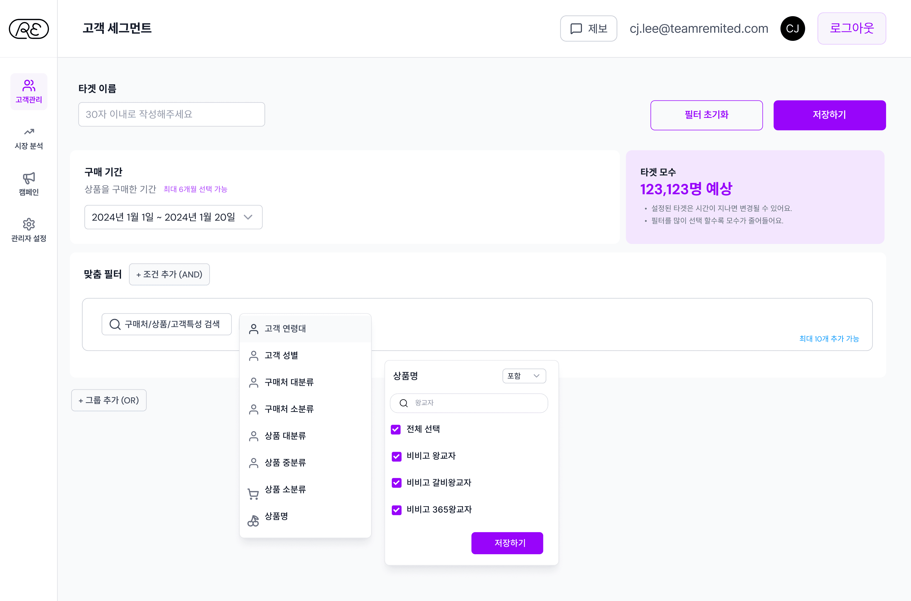 고객 성별, 연령대부터 구매 데이터 기반 정밀 필터 조합
