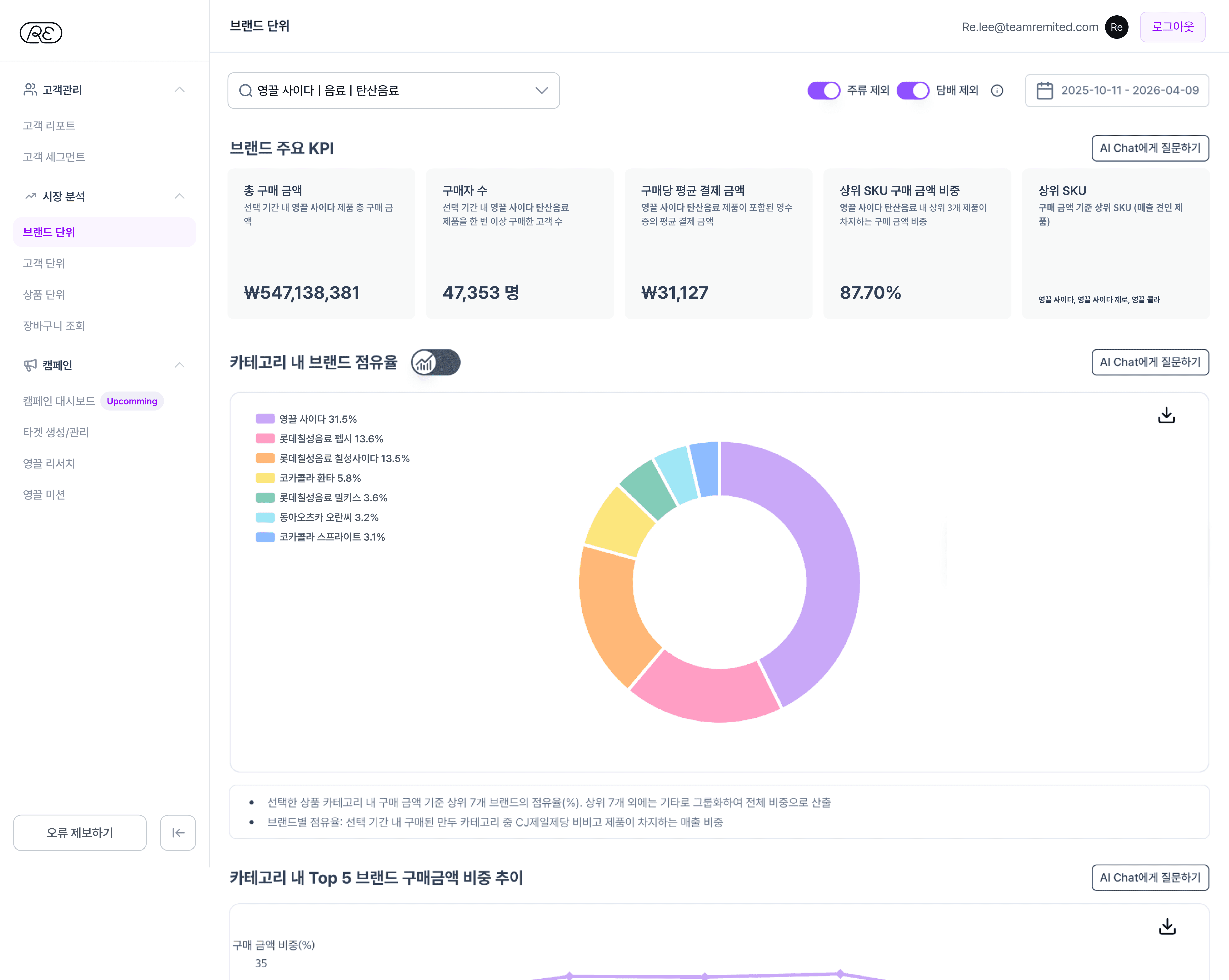 카테고리 내 브랜드 점유율, 채널별 경쟁 강도, 연령대×성별 구매자 분포까지. 시장에서 우리 브랜드의 포지션을 다각도로 비교합니다.