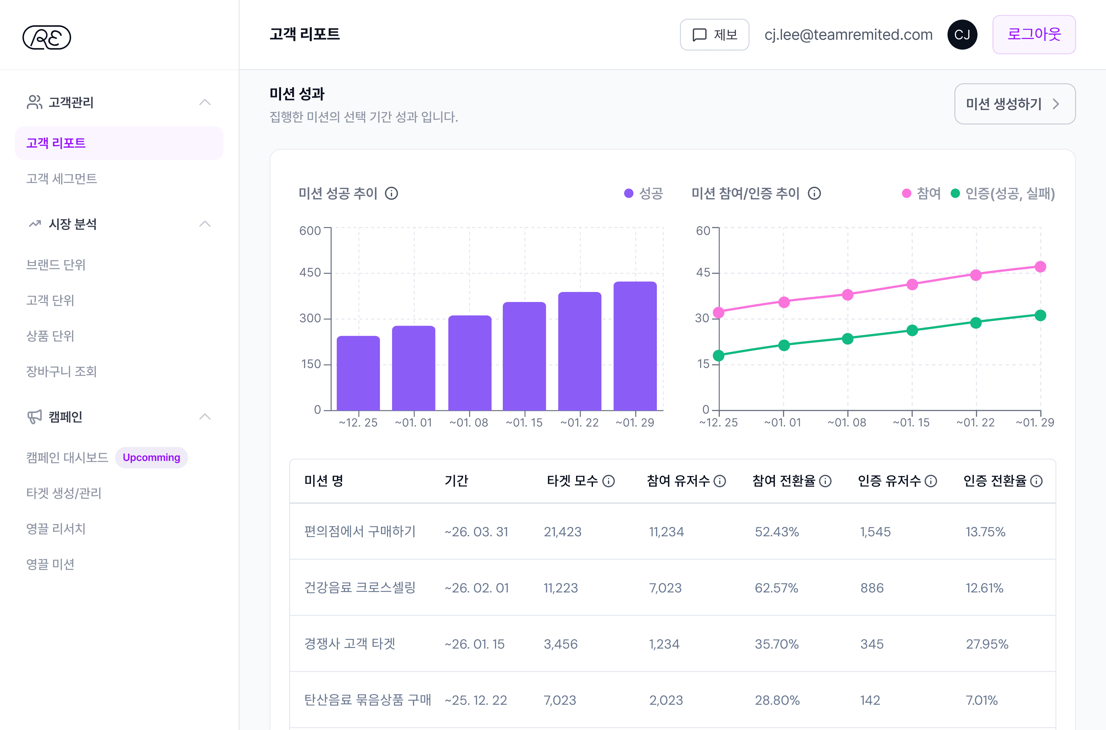 모든 캠페인을 하나의 화면에서 관리하세요. 미션 진행 현황부터 신청·참여 트렌드, 구매 데이터까지 한 번에 확인할 수 있습니다.
