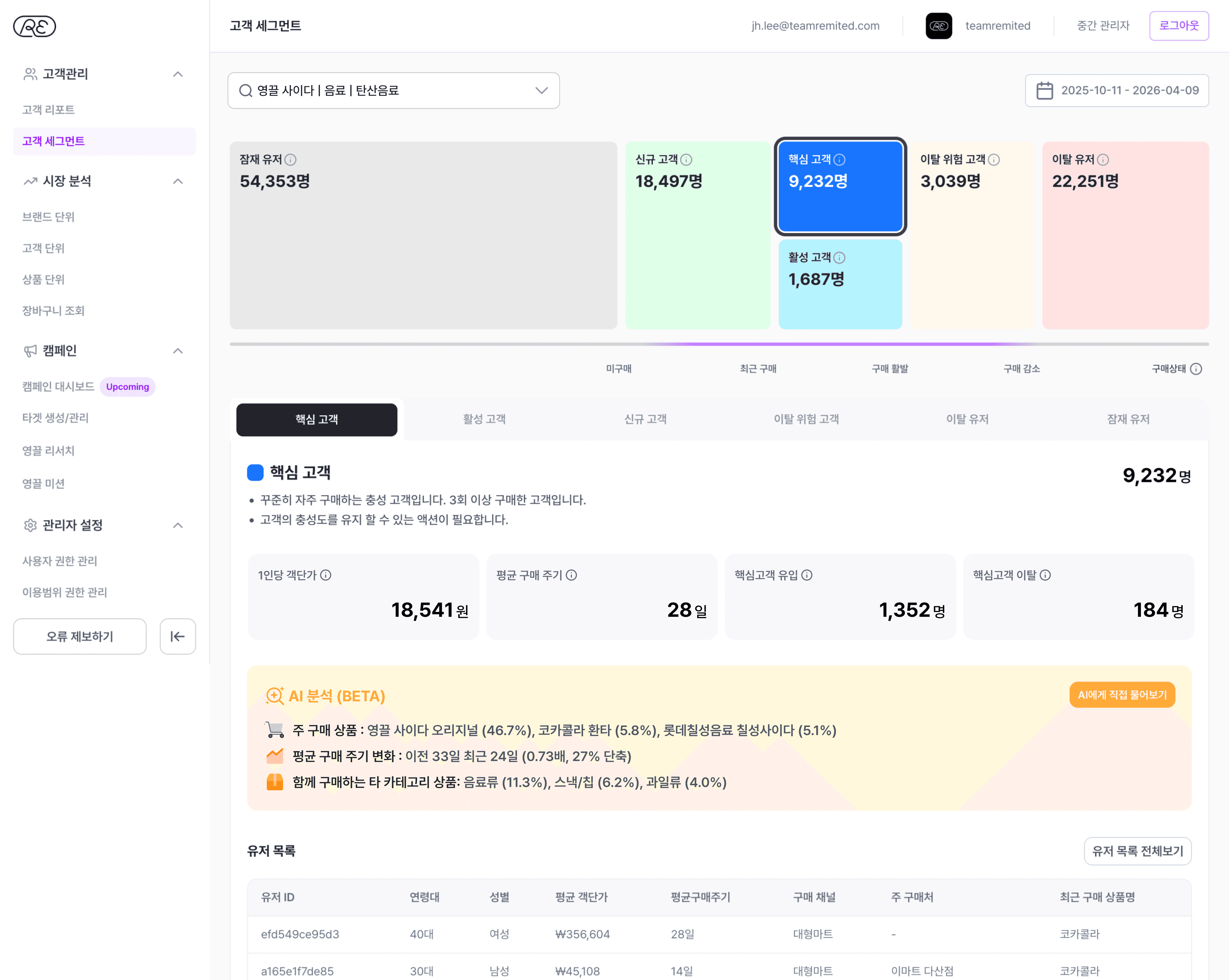 세그먼트별 객단가·구매 주기 비교 유저 목록 조회·다운로드로 캠페인 즉시 연결 이미지: 고객 세그먼트 대시보드 화면