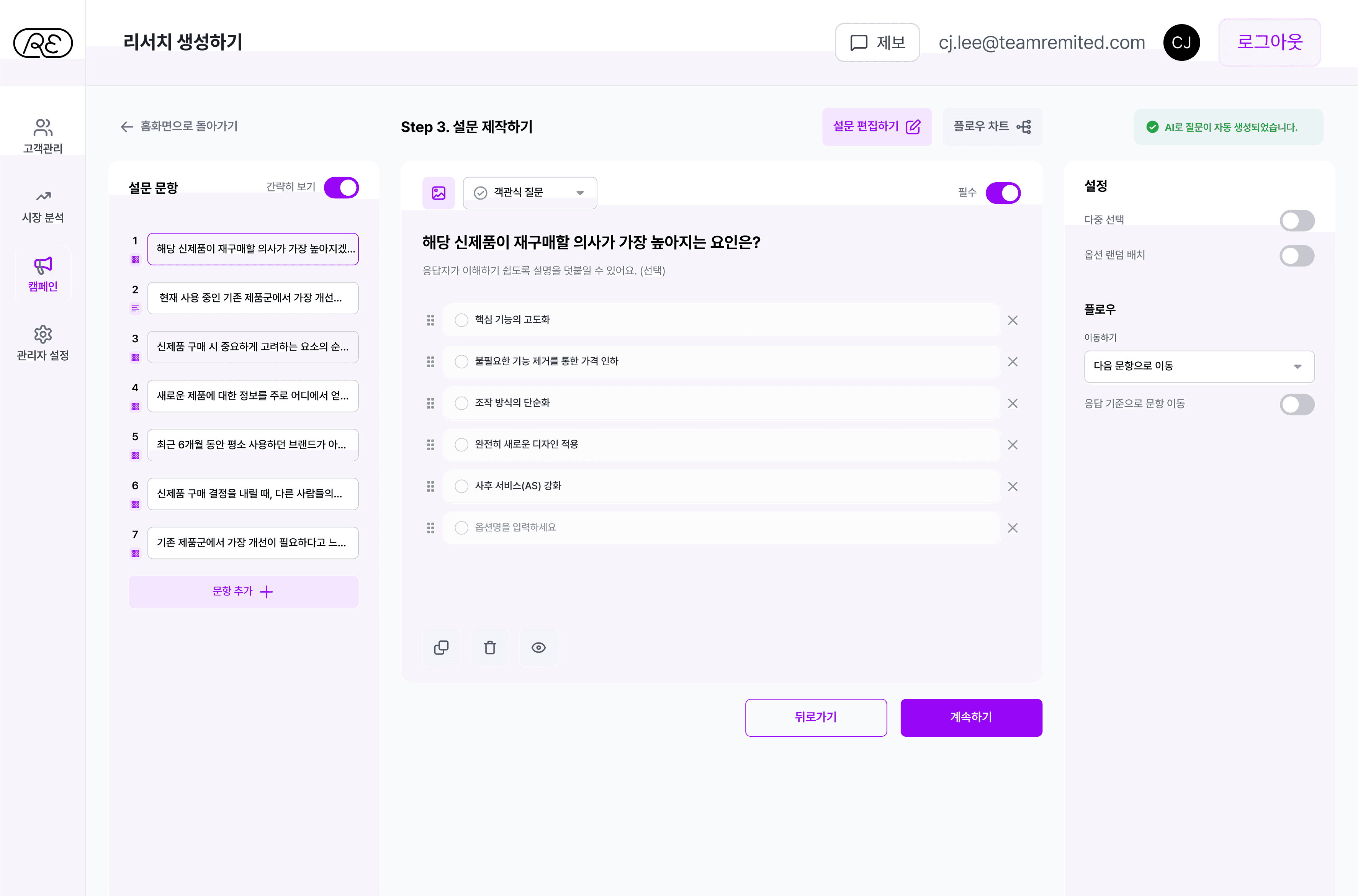 설문 목적을 입력하면 AI로 질문 항목 자동 생성