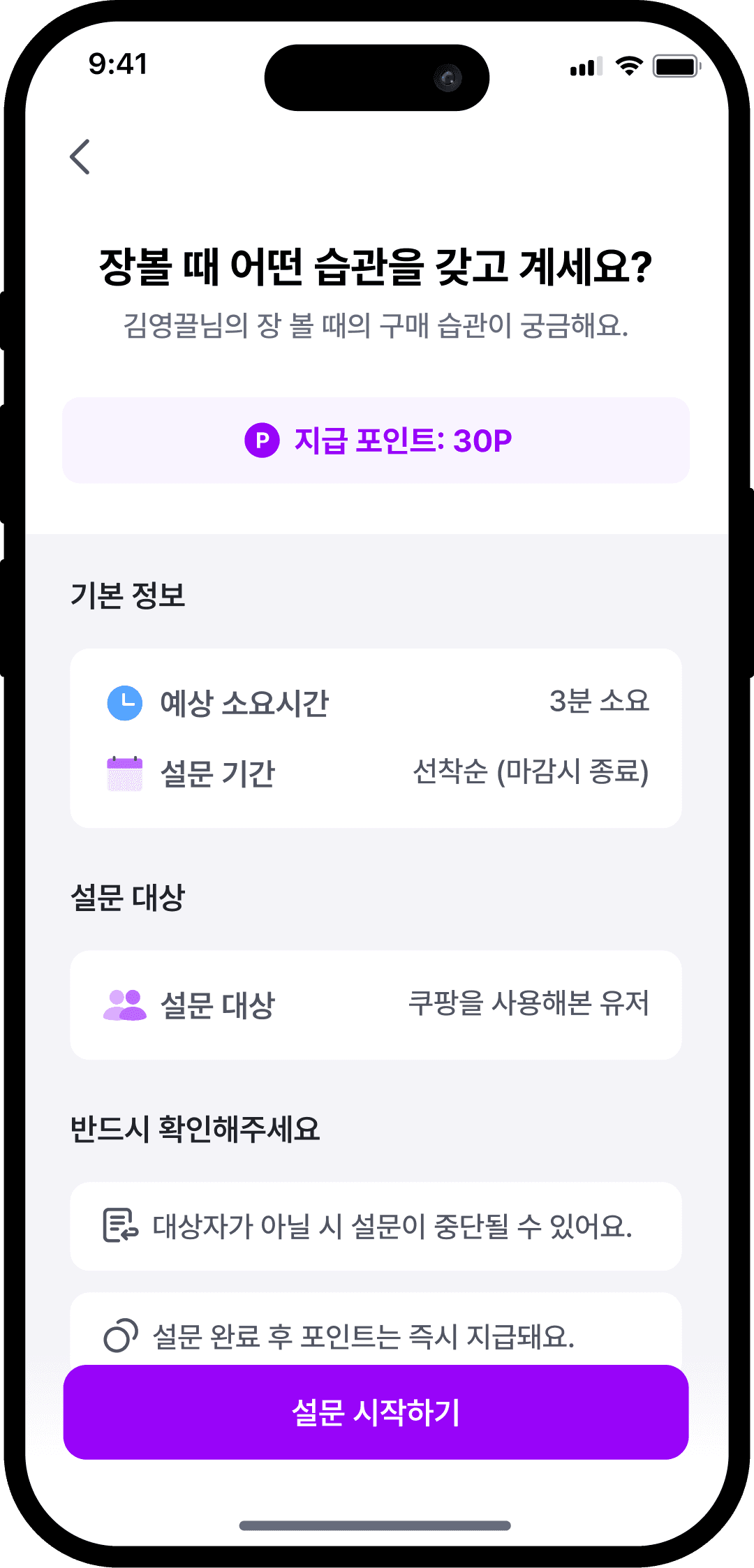 답변 내용과 구매 영수증을 바탕으로 내 관심사에 맞는 설문이 추천돼요.